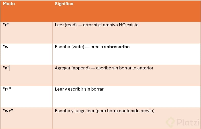 Cada modo define cómo se manipula el archivo. Elegir bien el modo evita pérdidas de datos o errores inesperados.