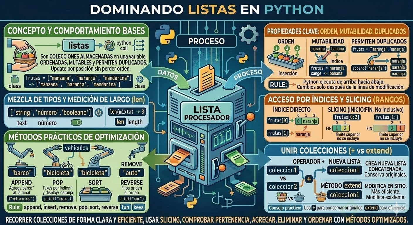 Aprende a dominar las listas en Python con ejemplos simples y prácticos. Entenderás qué son, cómo funcionan los índices, cómo modificar elementos y qué métodos usar para agregar, eliminar, ordenar y unir colecciones. Con estas bases, escribirás código más claro y efectivo.
