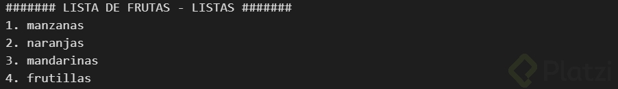 mixta = ["TuNombre", 42, True] print(mixta) # ['TuNombre', 42, True] print(type(mixta)) # <class 'list'> print(len(mixta)) # 3 print(len(frutas)) # 4