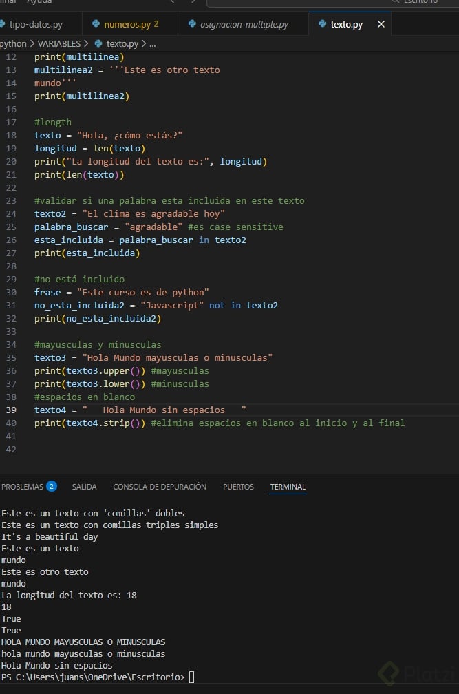 - Texto en múltiples líneas: comillas triples respetan saltos de línea.