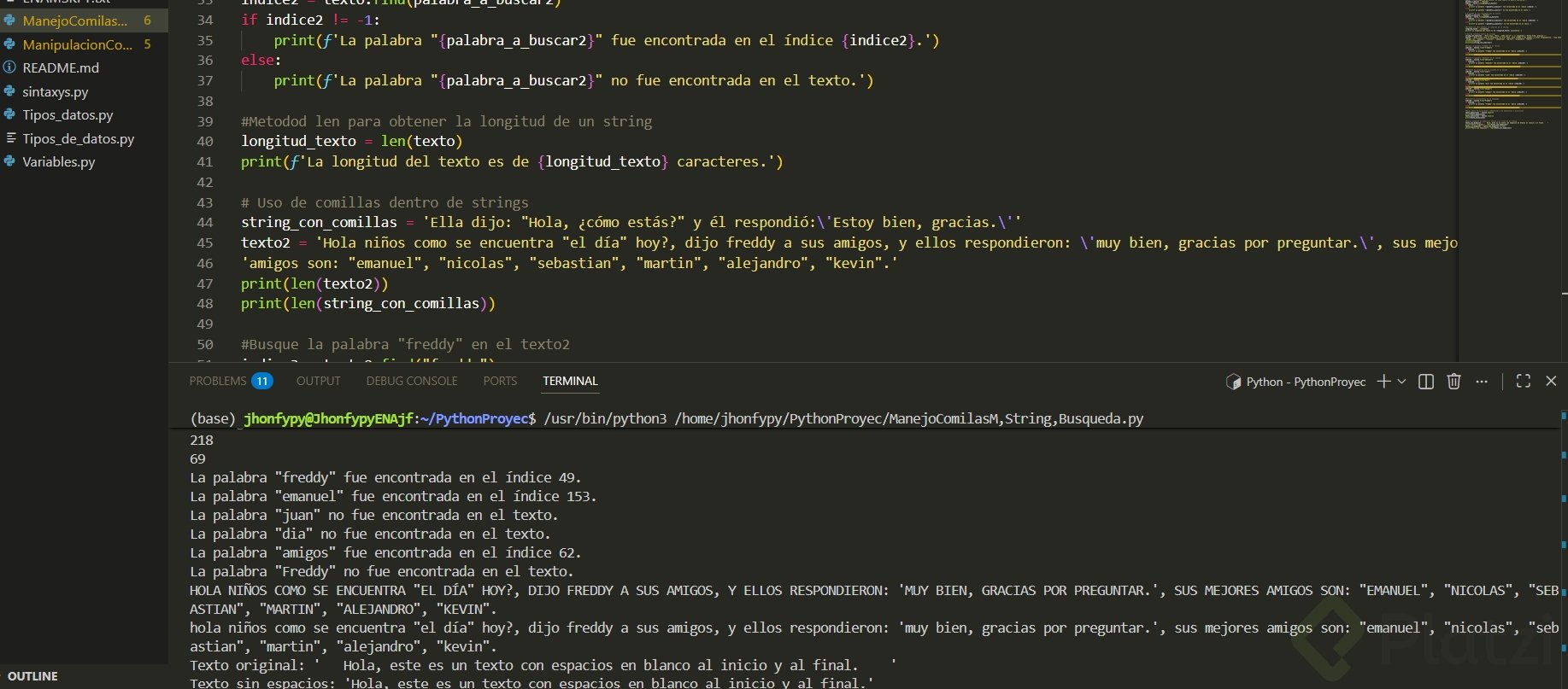 Domina las operaciones esenciales con cadenas en Python: manejo de comillas, múltiples líneas, conteo de caracteres, búsqueda de palabras, transformación a mayúsculas/minúsculas y limpieza de espacios. Con ejemplos claros y resultados esperados, entenderás cómo funcionan los métodos más usados de los strings sin errores comunes.