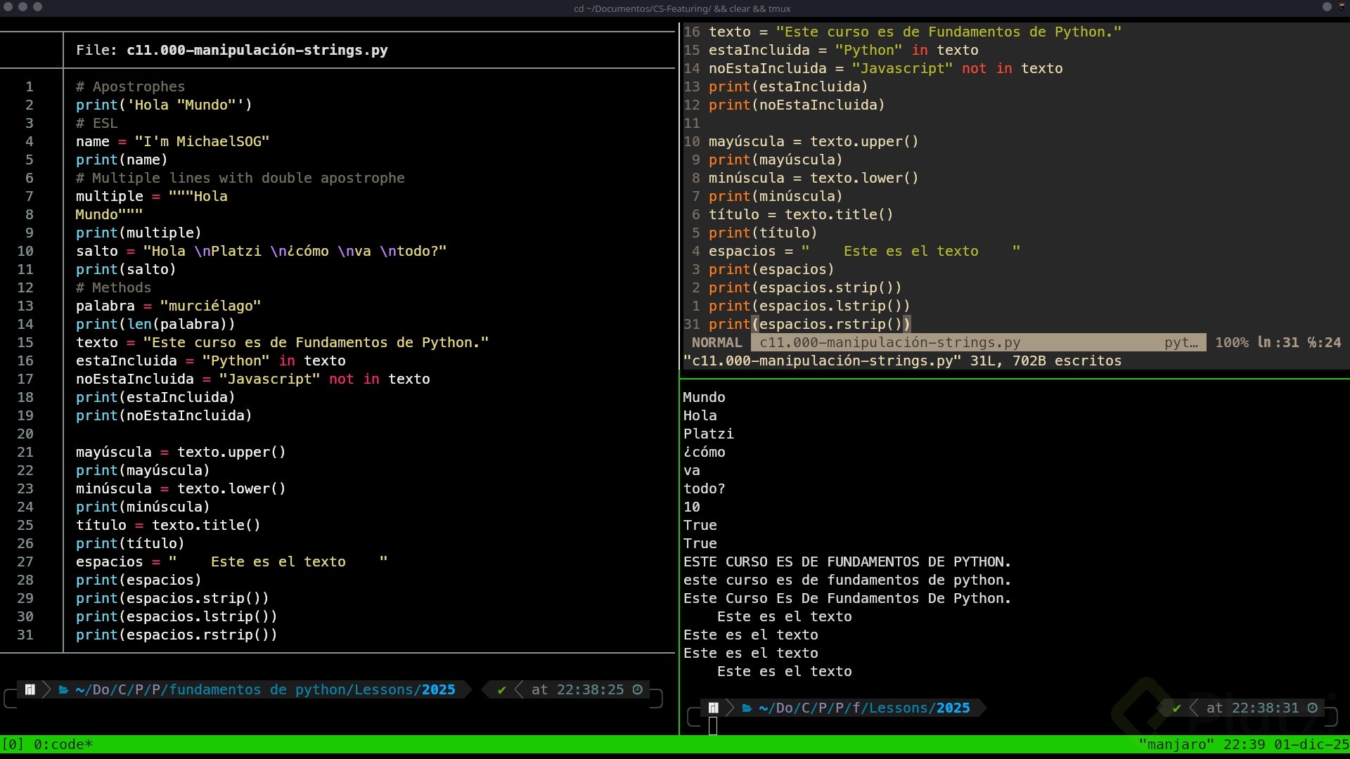 Para normalizar texto, usa upper y lower; para eliminar espacios al inicio y final, usa strip. Cuidado con la variable donde asignas el resultado: la última asignación prevalece.