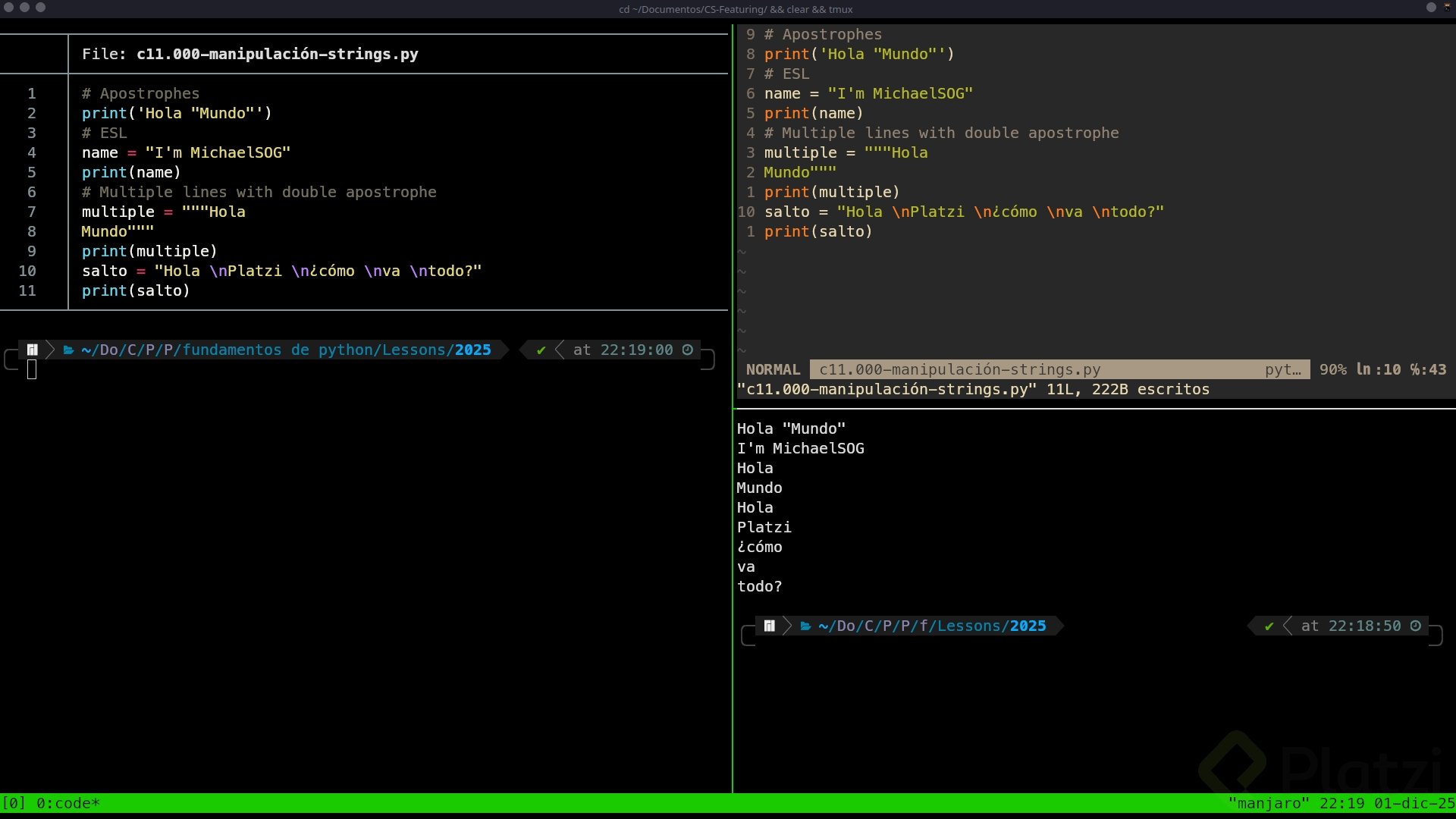 Tip útil: en frases en inglés con apóstrofos, usa comillas dobles por fuera para no romper el formato que espera Python en el intérprete.