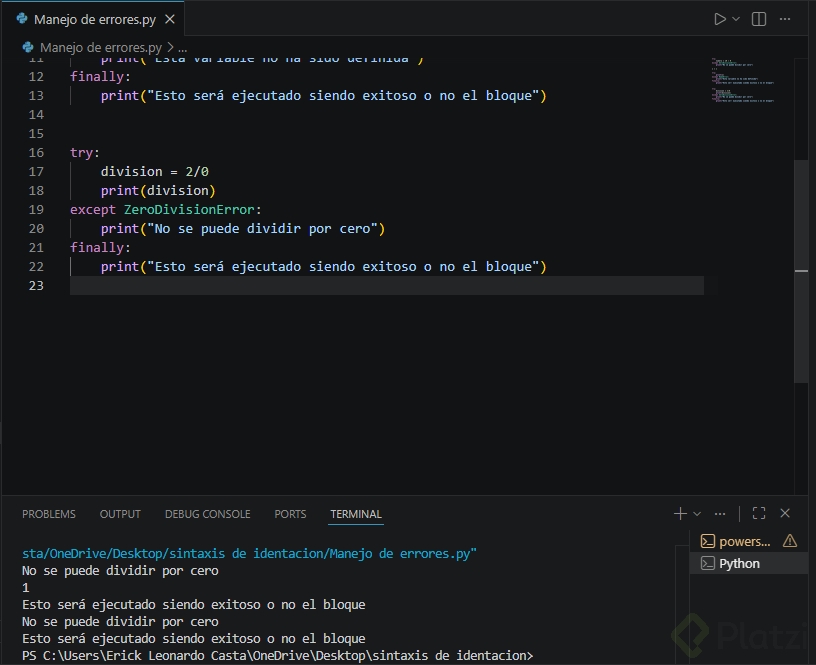 # Sin error: x = 1 try: print(x) except NameError: print("Esta variable no ha sido definida.") finally: print("Esto se ejecuta siempre.")
