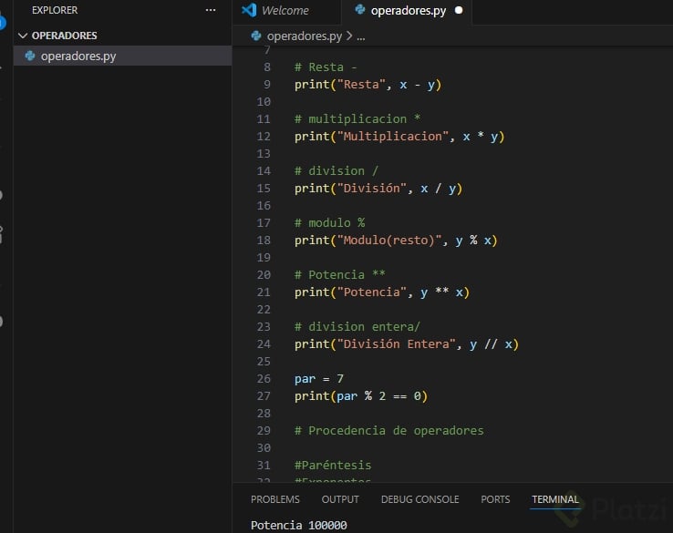 - Después: multiplicaciones, divisiones (/), divisiones enteras (//) y restos (%).