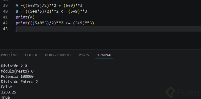 y = 10 x = 5 print("potencia", y ** x) # 100000 (10^5) print("división entera", y // x) # 2 print("división entera", 12 // 5) # 2 (sin decimales)