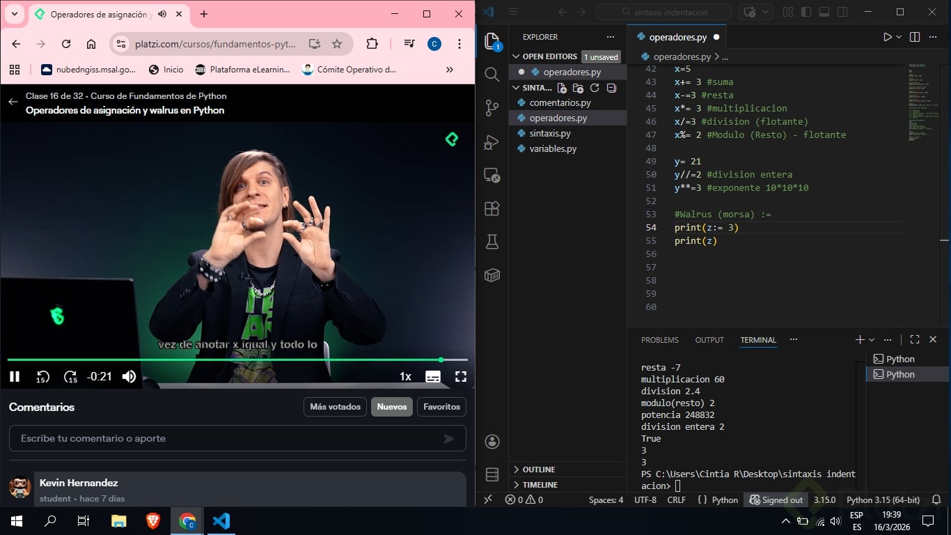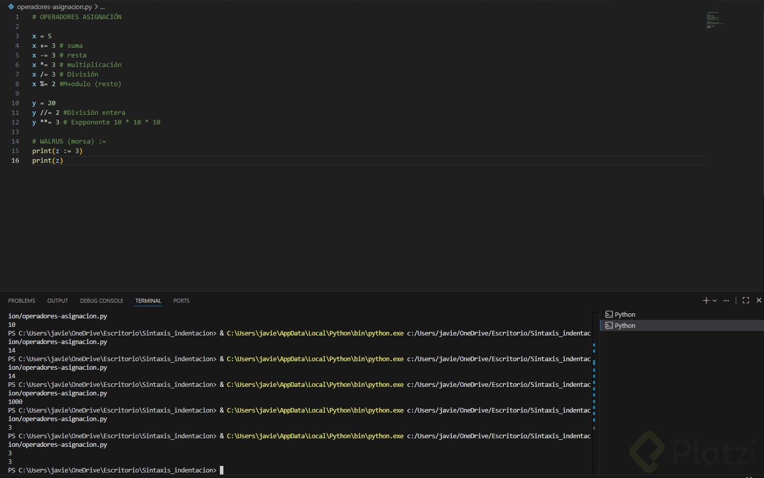 # Asignar dentro del print print(z := 3) # imprime 3 y, además, z queda asignada con 3 print(z) # 3 (ya estaba guardado)