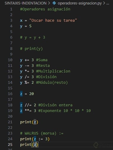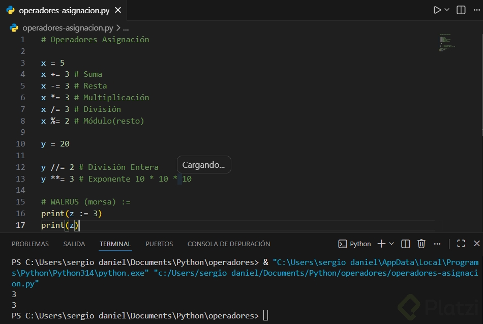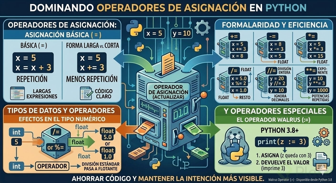 Aprende a escribir código más claro y corto en Python dominando operadores de asignación como +=, -=, =, /=, %=, //=, = y el operador walrus* (:=). Con ejemplos simples verás cómo actualizar variables sin repetirlas y cómo estos operadores afectan los tipos numéricos.