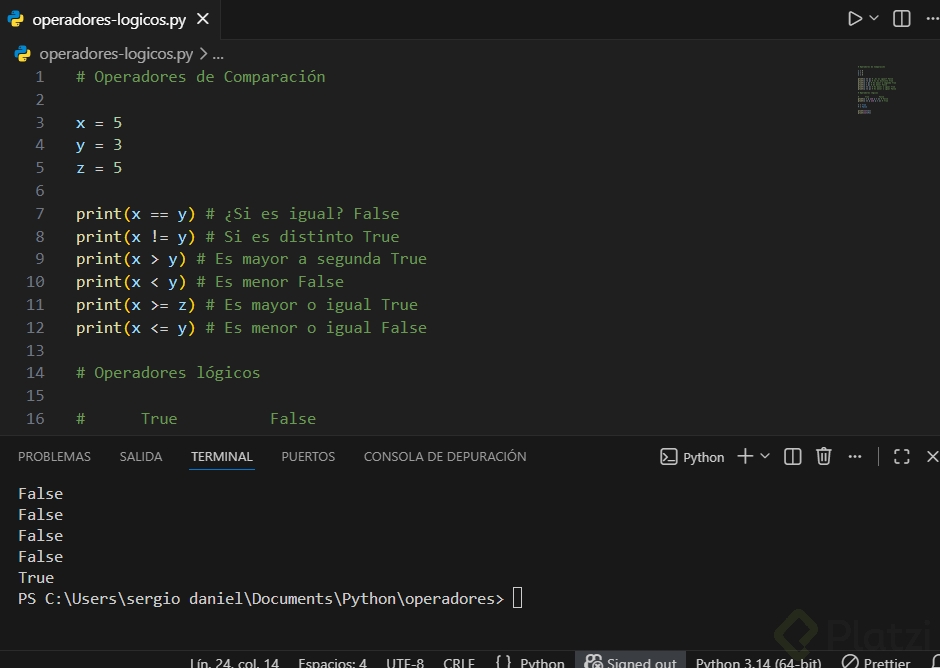 - Palabras clave: operadores lógicos, booleanos, igualdad (==), mayor que (>), condiciones, flujo de control, Python.