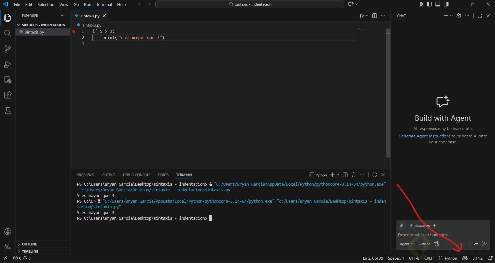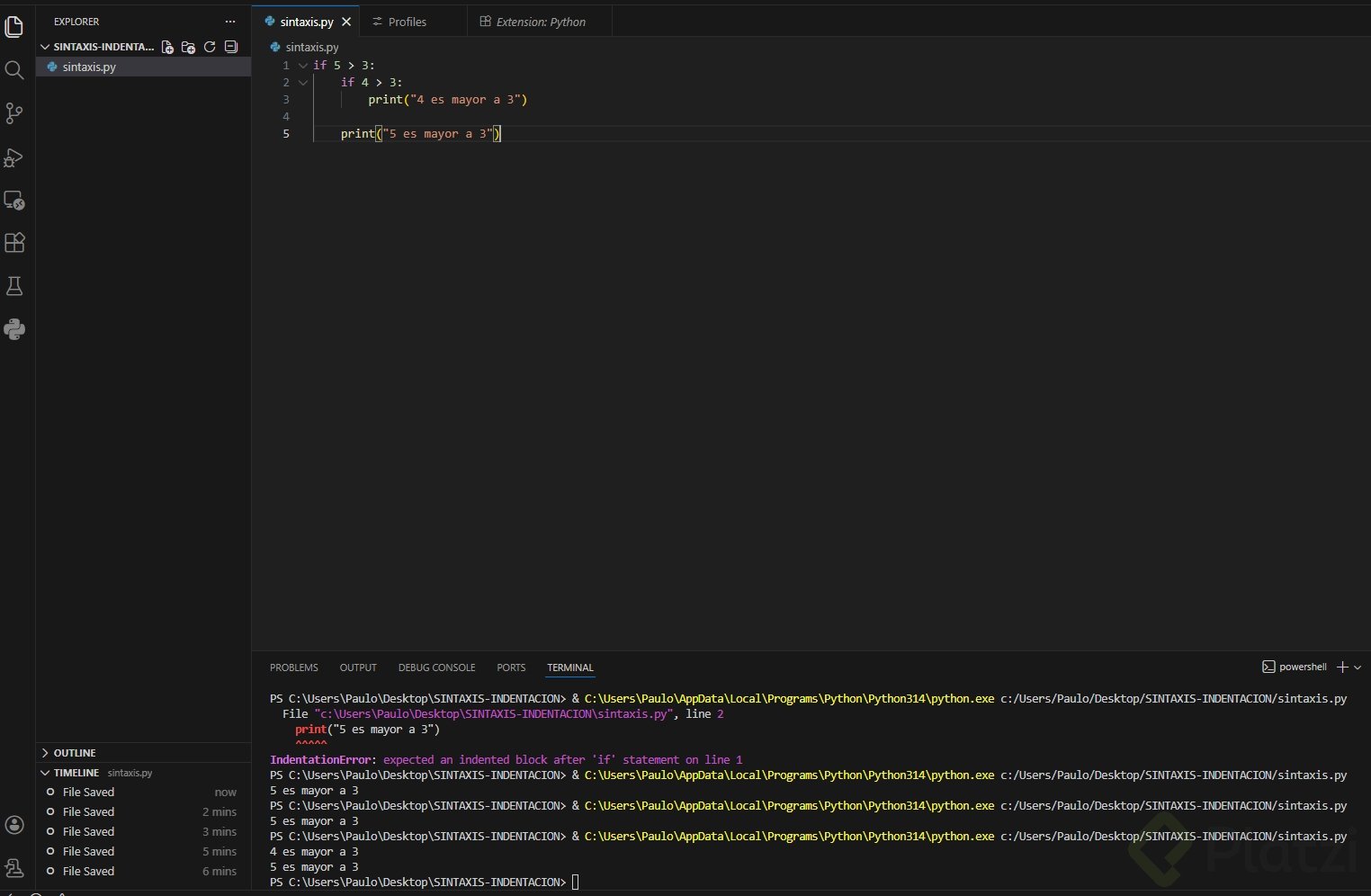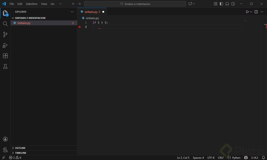 - Al ejecutar, obtendrás un error de sintaxis por indentación en la línea del bloque.