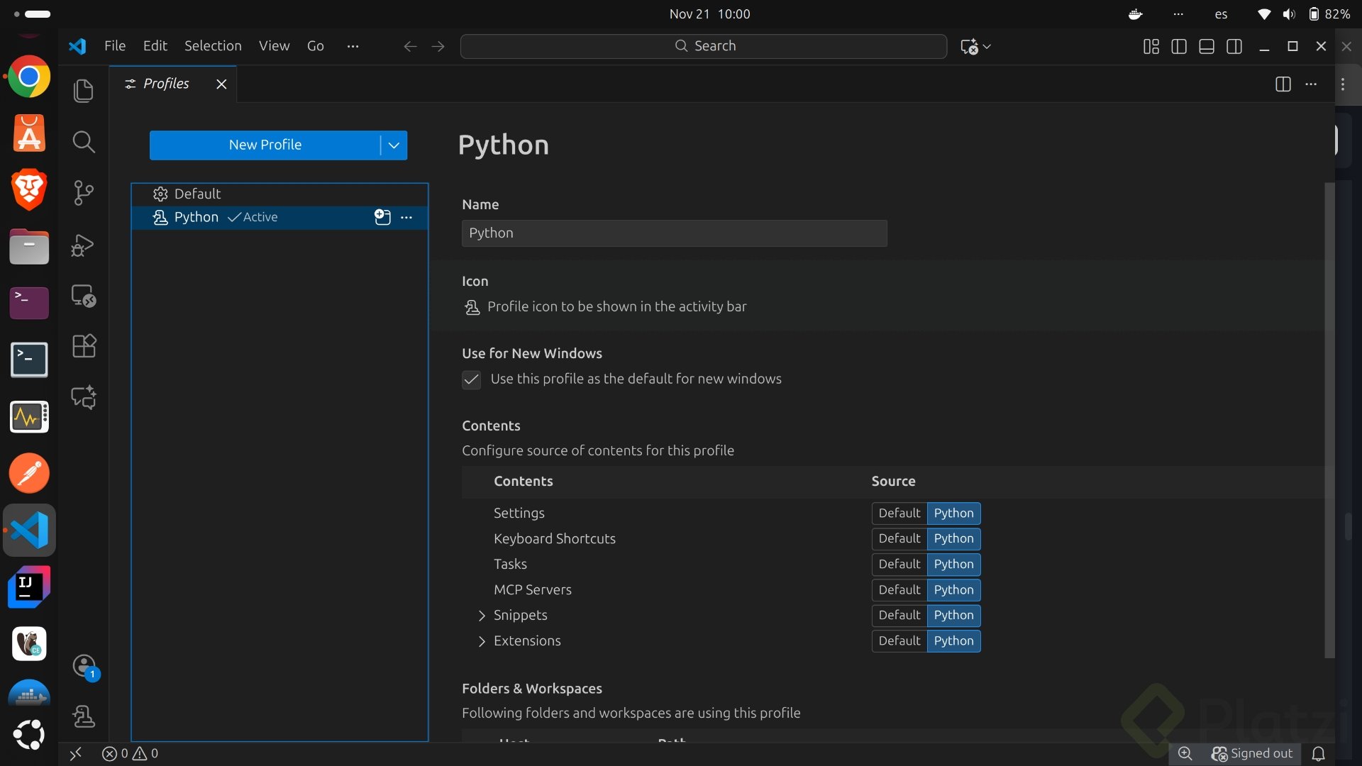 - Abre la ruedita de configuración, busca “profile” y entra a profiles.