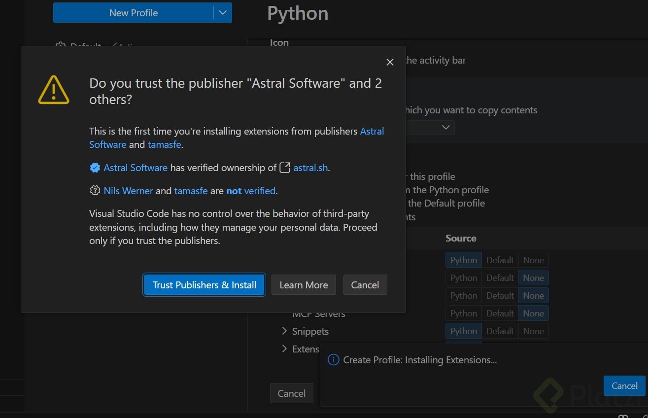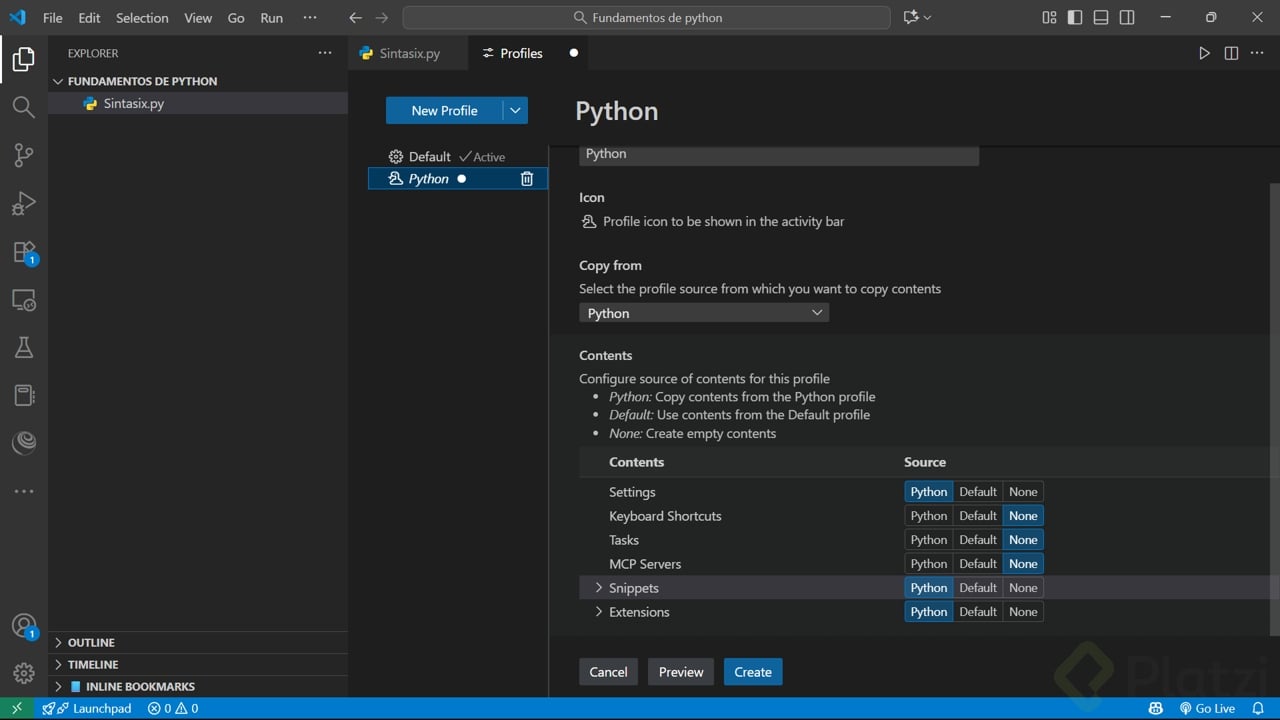 - Usa la opción copy from para elegir el perfil sugerido de Python y pulsa create.
