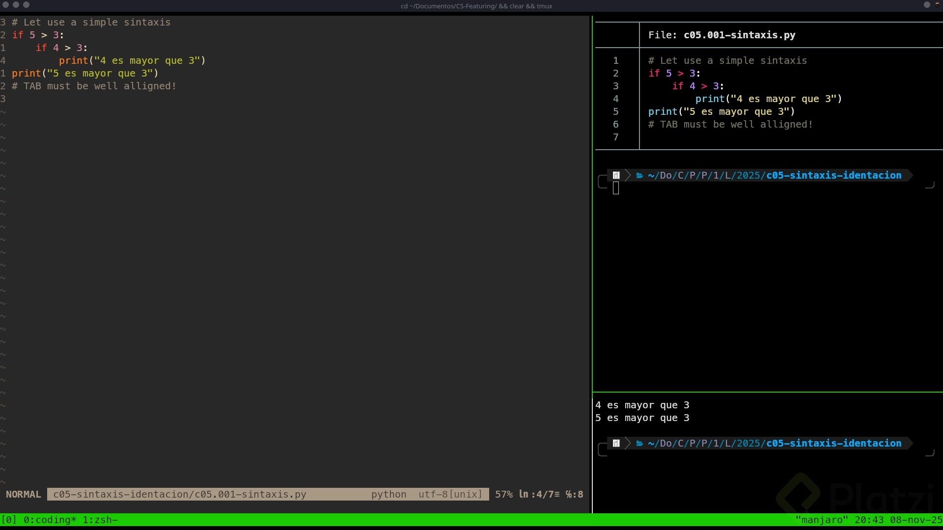 - Regla básica: termina la condición con “:”, pulsa Enter e indenta el bloque.