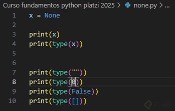Aunque ciertos valores “no contengan información”, no se convierten en None. Siguen siendo del tipo que les corresponde. Esto evita confusiones entre “vacío” y “ausencia de valor”.