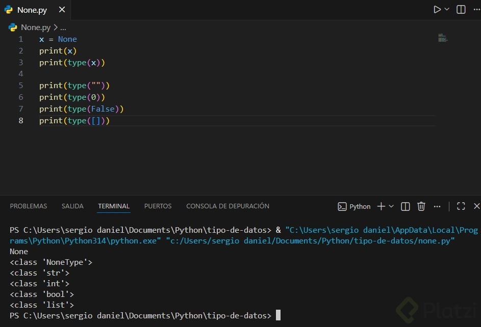 x = None print(x) # Muestra: None print(type(x)) # Muestra: <class 'NoneType'>