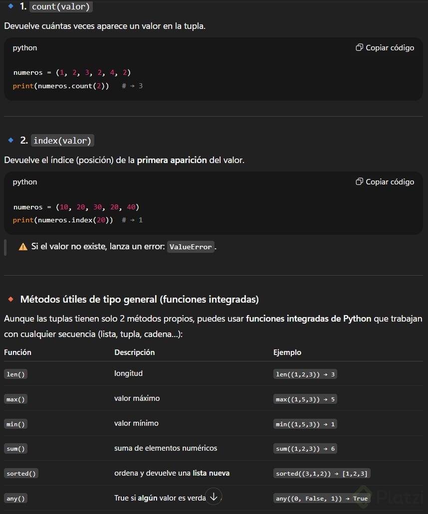 - Truco para “modificar”: convierte a lista, usa append, y vuelve a tupla (casting).