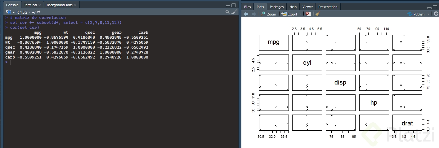 La función cor nos retorna la correlación entre los datos. Recordemos que el valor de una correlación va de -1 a 1, si se acerca a 0 no hay correlación.