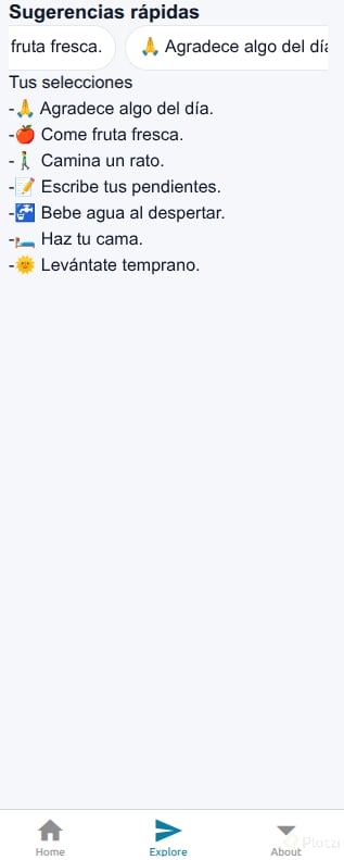 En Explore, necesitas registrar lo que el usuario selecciona. Usa useState para un arreglo de hábitos sugeridos elegidos y pásale al componente QuickAddChips un callback que agregue ítems al estado. Además, incluye textos guía como “Sugerencias rápidas” y “Seleccionados” para claridad.