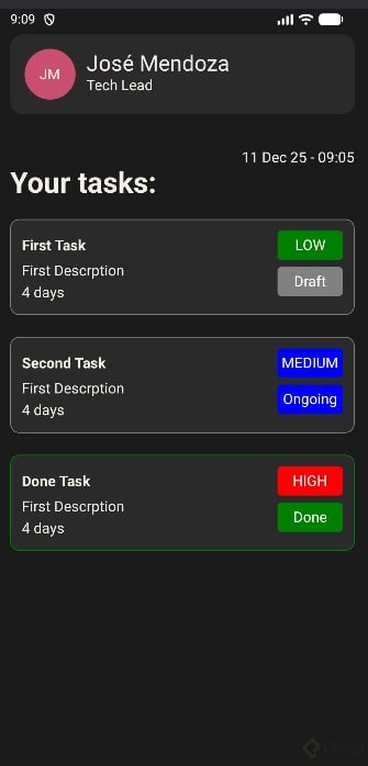 Integra el componente en la pantalla, importa y pasa las props name y role. Reemplaza Text por ThemeText en el resto de la interfaz para heredar el modo oscuro automáticamente. Como reto, cambia View por ThemeView y asigna colores por tema directamente.Usa ThemeText en mensajes como “buenas tardes” y el saludo principal.