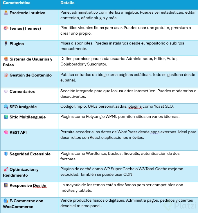 - Plugins: Son herramientas adicionales que se ejecutan junto con los temas, permitiendo añadir nuevas funcionalidades o modificar las existentes.