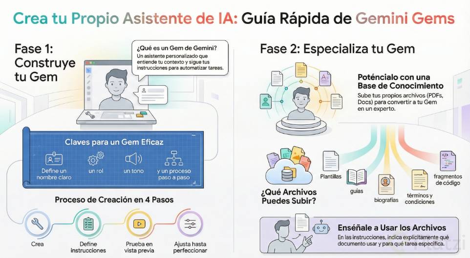 Acelera tu trabajo en Gemini creando asistentes personalizados que entienden tu contexto, siguen un prompt de sistema claro y aplican una base de conocimiento propia. Con un par de clics puedes transformar tareas repetitivas en flujos guiados y confiables: propuestas comerciales, análisis de marketing, o creación de letras para música con Suno.