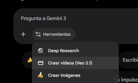- O en Herramientas: crear videos (verás entre paréntesis la versión: Veo 3.1).