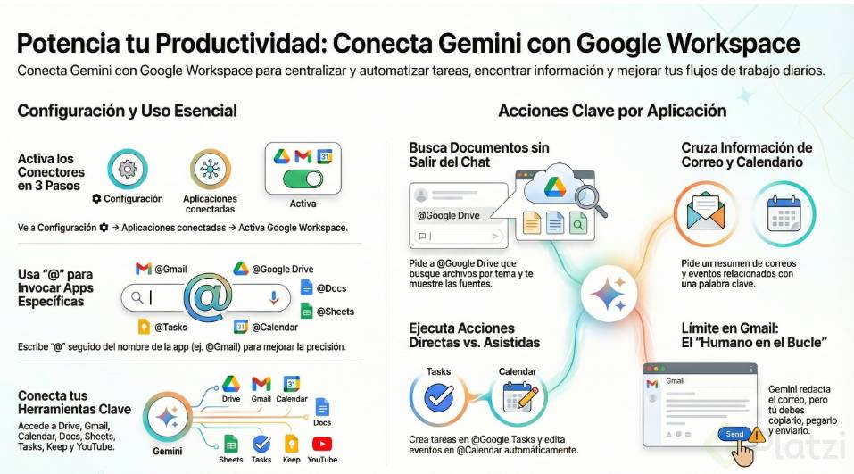 Centraliza tu productividad con Gemini y Google Workspace. Activa los conectores para que tu asistente acceda a Drive, Calendar, Gmail, YouTube y Google Tasks, y así encontrar documentos, cruzar información y ejecutar acciones concretas sin salir del chat. Con un buen prompting y el uso del arroba, llevarás tus flujos diarios a otro nivel.