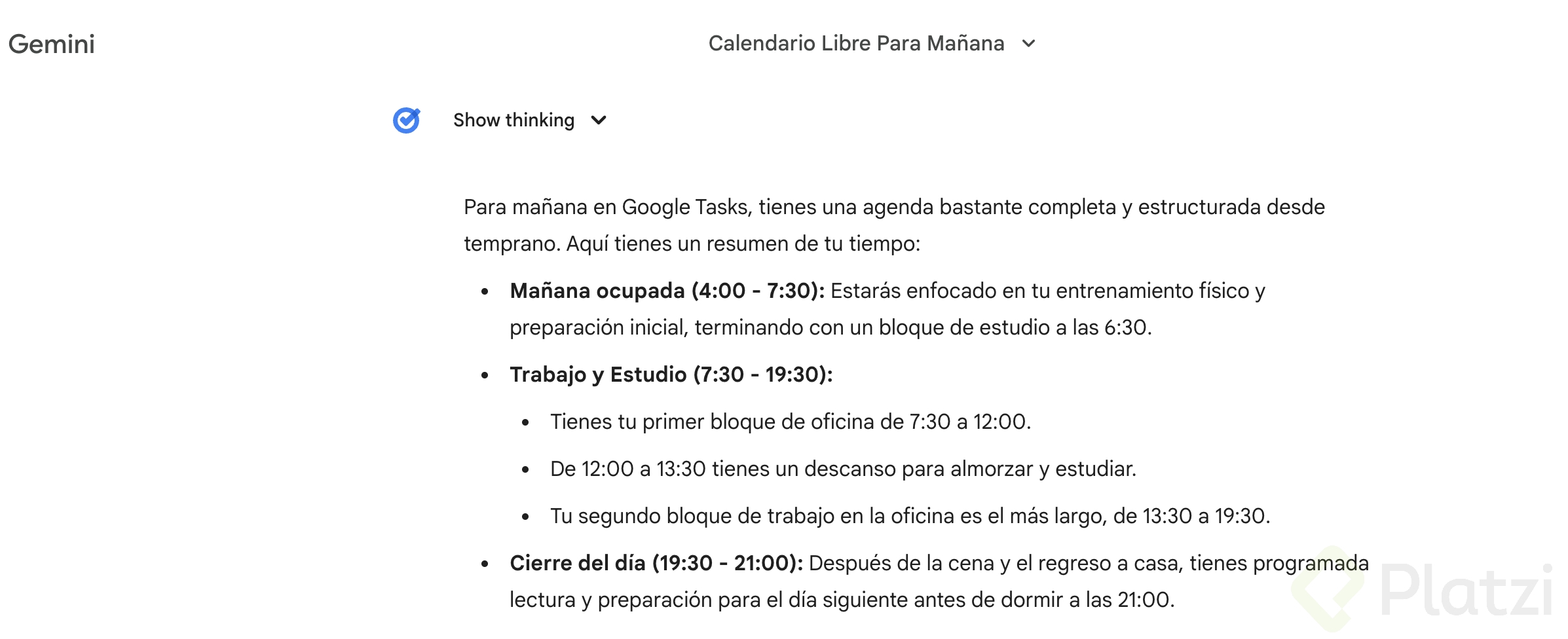 - Pide: revisa mi Gmail y Calendar con la keyword “Platzi”.