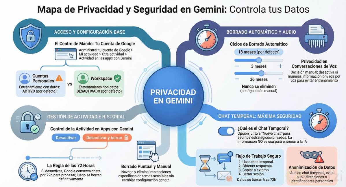 La privacidad en Gemini depende de decisiones claras del usuario. Aquí aprenderás a configurar la actividad, la voz y el chat temporal para mantener datos sensibles fuera del entrenamiento de modelos y optimizar tu uso diario. En cuentas personales, Google puede usar tus interacciones para mejorar sus servicios; en Google Workspace esto viene desactivado por defecto.