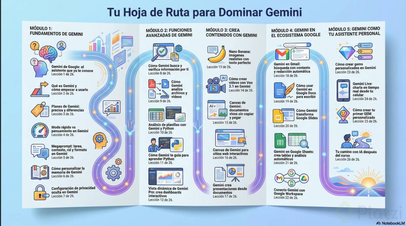El modelo Gemini es un large language model que hoy es multimodal: acepta texto, imágenes, video y audio, y puede generar texto, imágenes, audios o videos según lo que necesites. Su conocimiento es estático: fue entrenado con información hasta una fecha de corte y no “aprende en vivo” de tus conversaciones; se actualiza cuando Google publica una nueva versión. Además, opera con la capacidad de cómputo de los servidores de Google, lo que permite trabajar con gran velocidad en creación de documentos, análisis de datos y desarrollo de código y aplicaciones.
