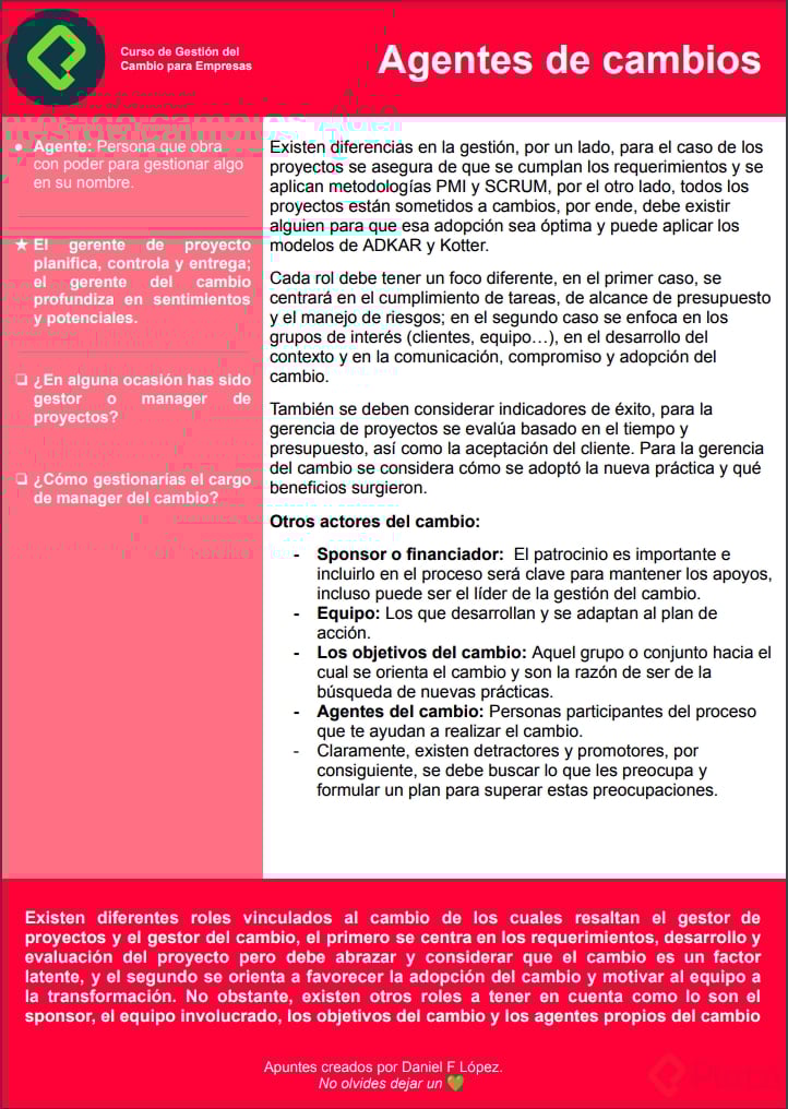 Cada proyecto o iniciativa implica un cambio. Aquí es donde intervienen los gestores de cambio, cuya función principal es garantizar una adopción óptima de nuevas prácticas. Los gestores de cambio pueden usar diversas metodologías, como el modelo ADKAR, KOTTER, CM BOOK, o el cuerpo de conocimiento de gestión del cambio.