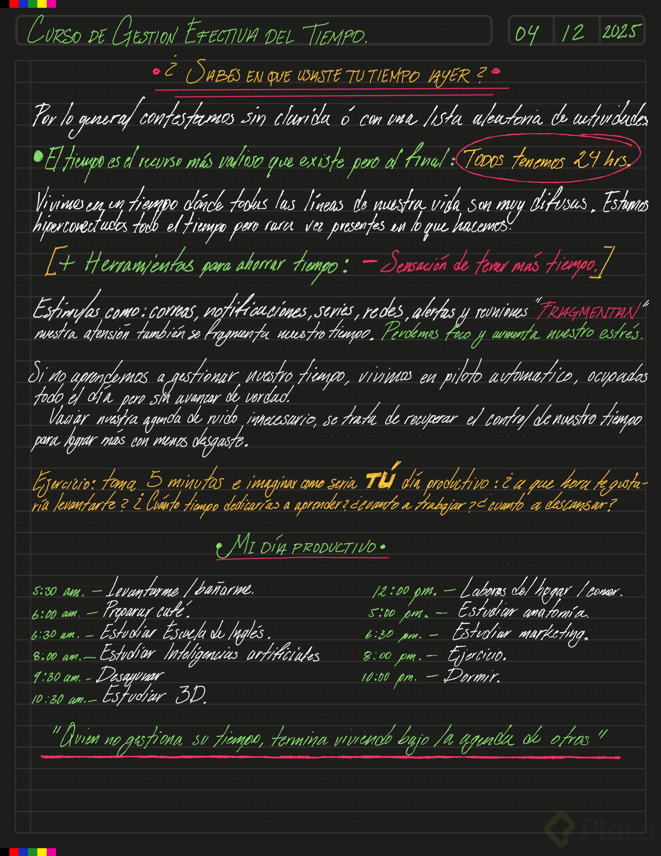 - Avanzar con propósito: “quien no gestiona su tiempo termina viviendo bajo la agenda de otros”.