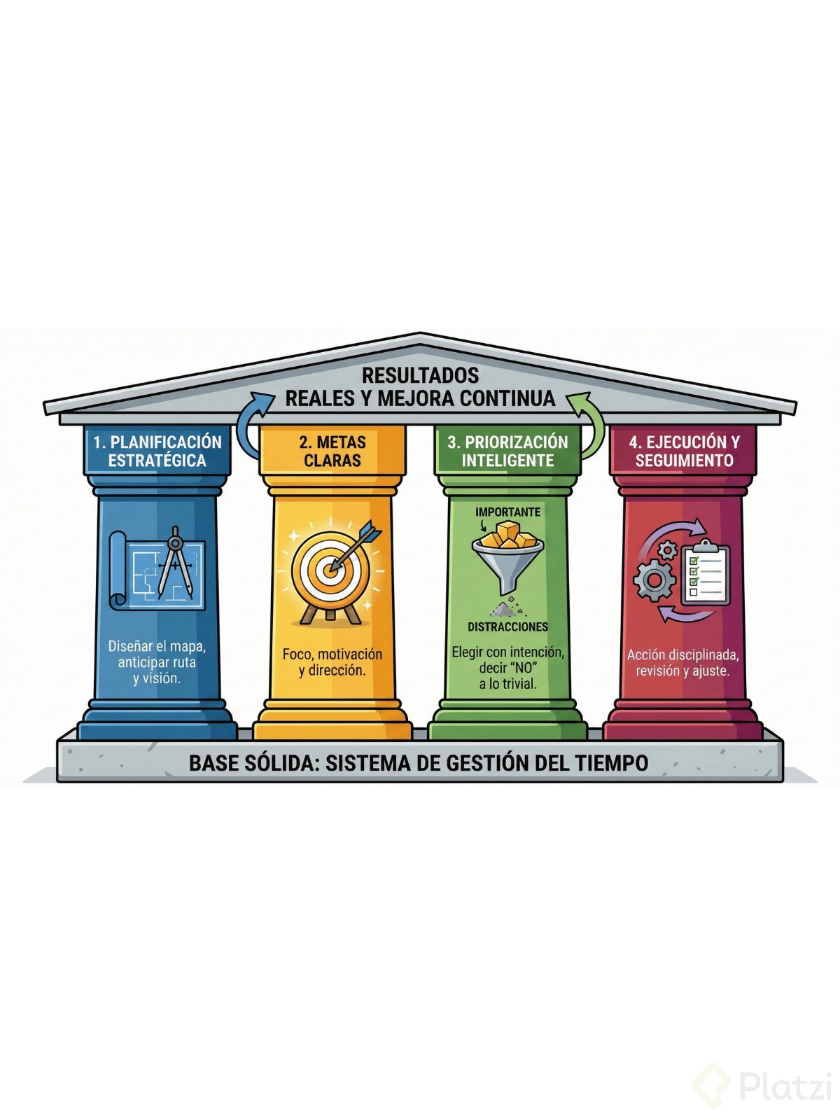 El tiempo es tu recurso más valioso y manejarlo bien exige una base clara. Aquí encontrarás una guía práctica y directa para aplicar los cuatro pilares del manejo del tiempo: planificación estratégica, metas claras, priorización inteligente y ejecución con seguimiento. Juntos forman un sistema que impulsa claridad, enfoque, acción y mejora continua.