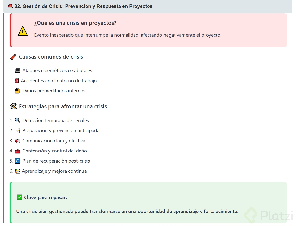 Con cada crisis gestionada, se acumula experiencia y sabiduría, haciendo de los proyectos no sólo más resistentes, sino también innovadores y eficaces. Recuerda que en la próxima clase, aprenderás de expertos cómo han enfrentado y superado crisis en sus propios proyectos. ¡No te lo pierdas!