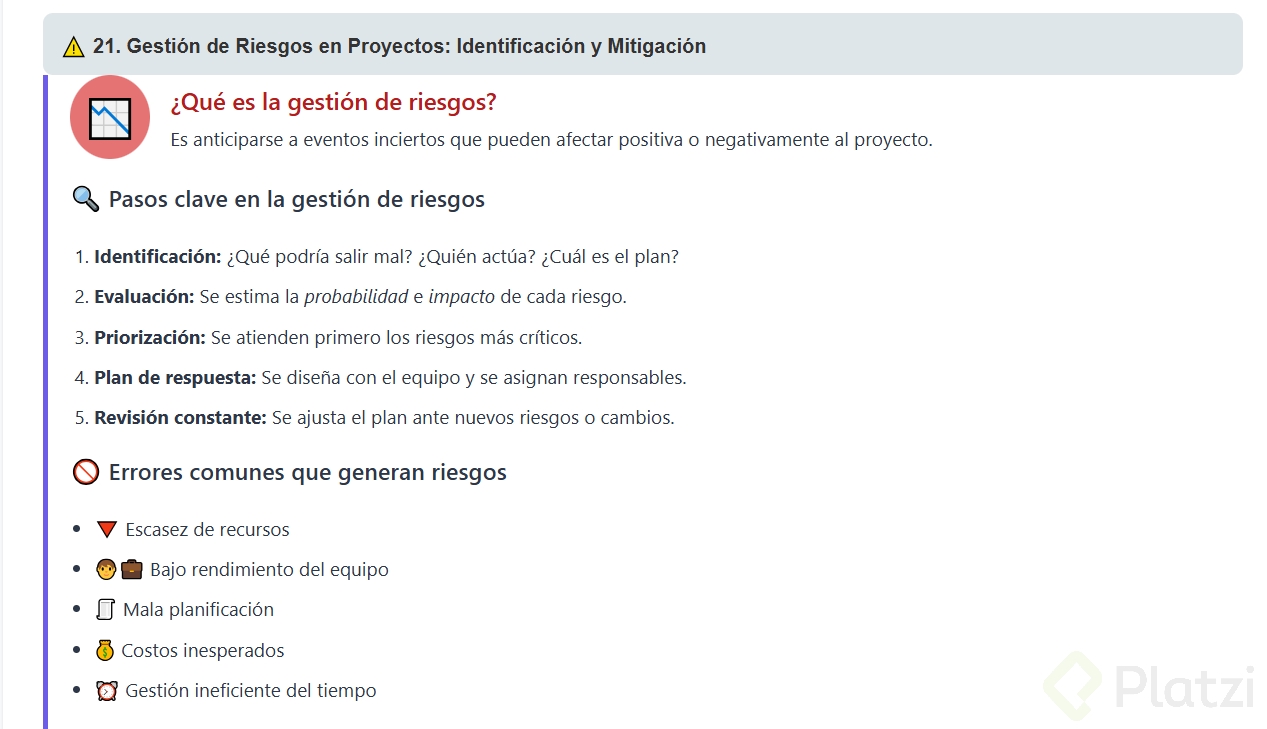 La gestión de riesgos es un componente crítico en la dirección de proyectos. La capacidad de un gestor de proyecto para prever y manejar eventos inciertos puede determinar el éxito o fracaso de un proyecto. Un riesgo se define como un evento o condición incierta con el potencial de tener un impacto positivo o negativo en un proyecto. Estos eventos pueden ser naturales, como huracanes o terremotos, o podrían ser internos del proyecto, como la escasez de recursos.