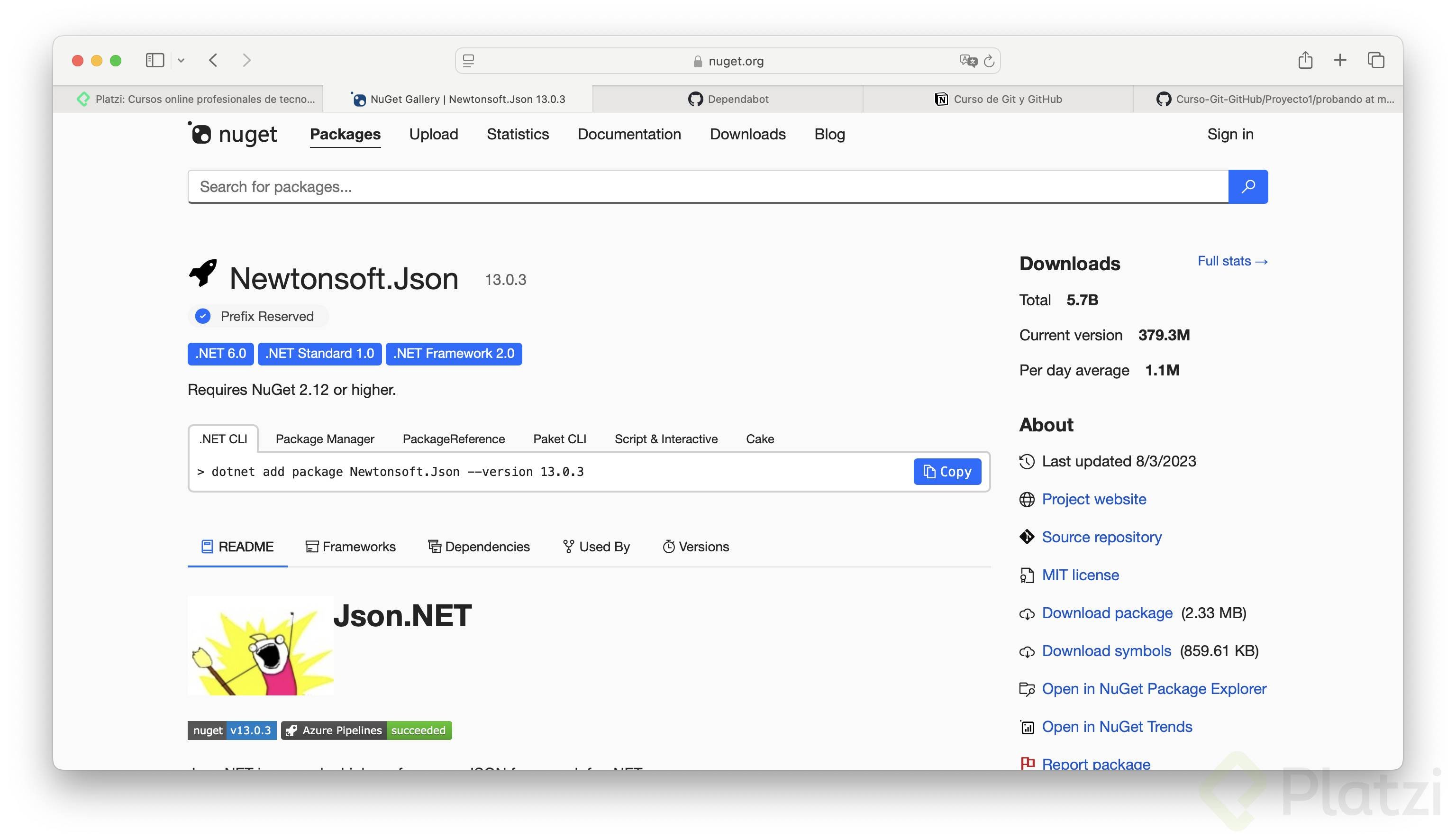 - Navega a la pestaña del paquete deseado (por ejemplo, Newtonsoft.Json).