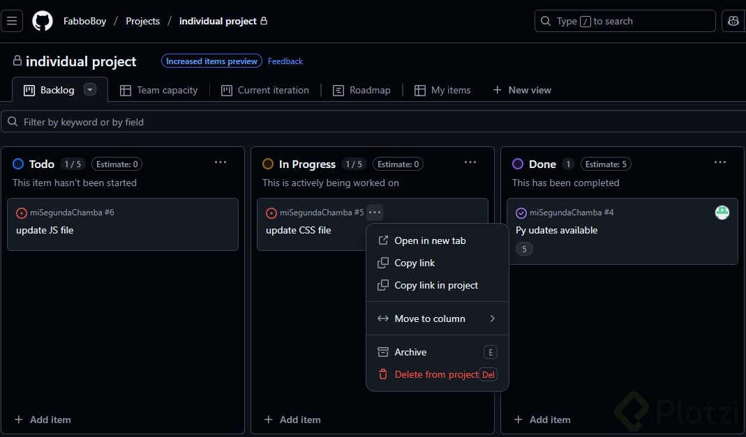 - Selecciona una actividad como “Actualizar archivo CSS,” presiona los tres puntos y conviértela en un issue en el repositorio.