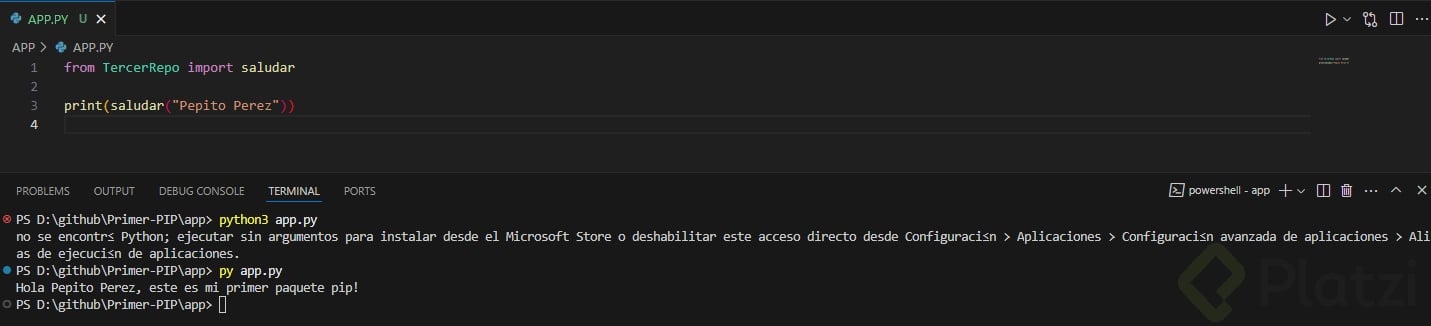 app.py, usafrom <nombre_del_paquete> import <método>, y escribe un código sencillo que ejecute este método, por ejemplo,print(saludo("Platzi")). - Ejecutar la aplicación: Desde la terminal, navega hasta la carpeta