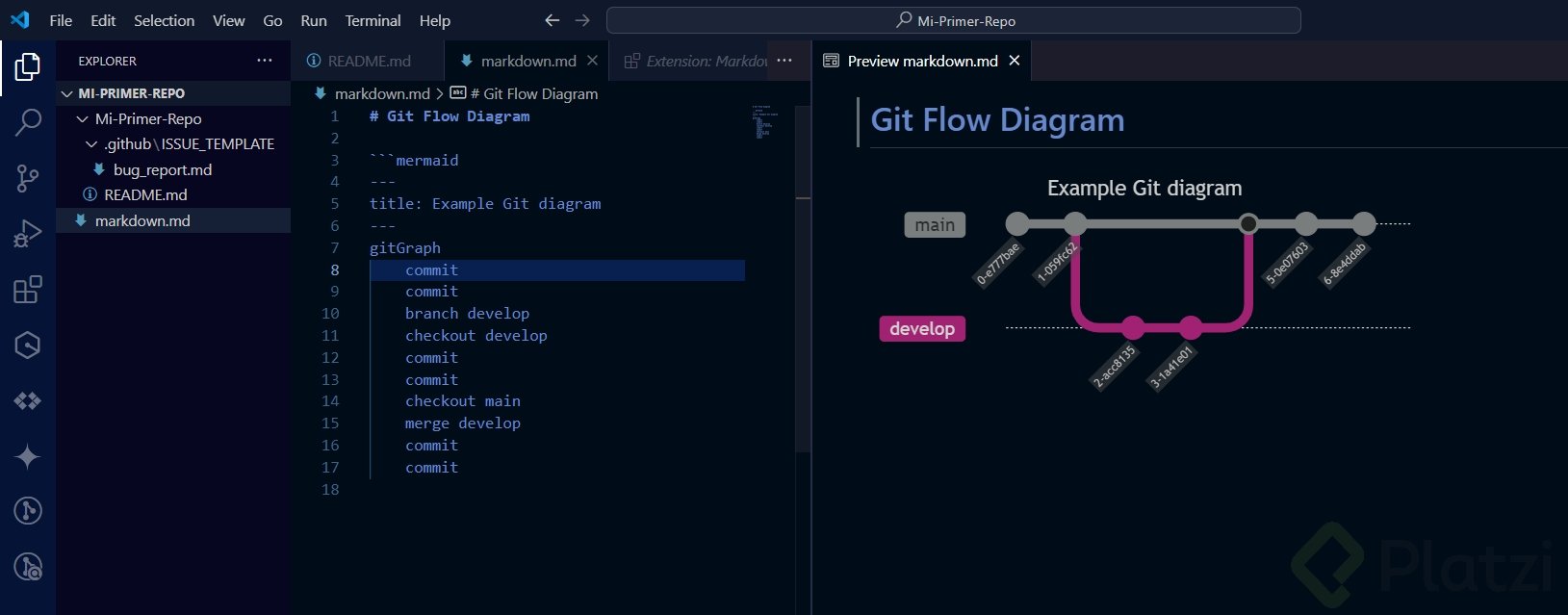 Por ejemplo, gracias a un código similar al siguiente podrás representar el flujo de interacción entre diferentes ramas, muy acorde a nuestro curso ¿no?