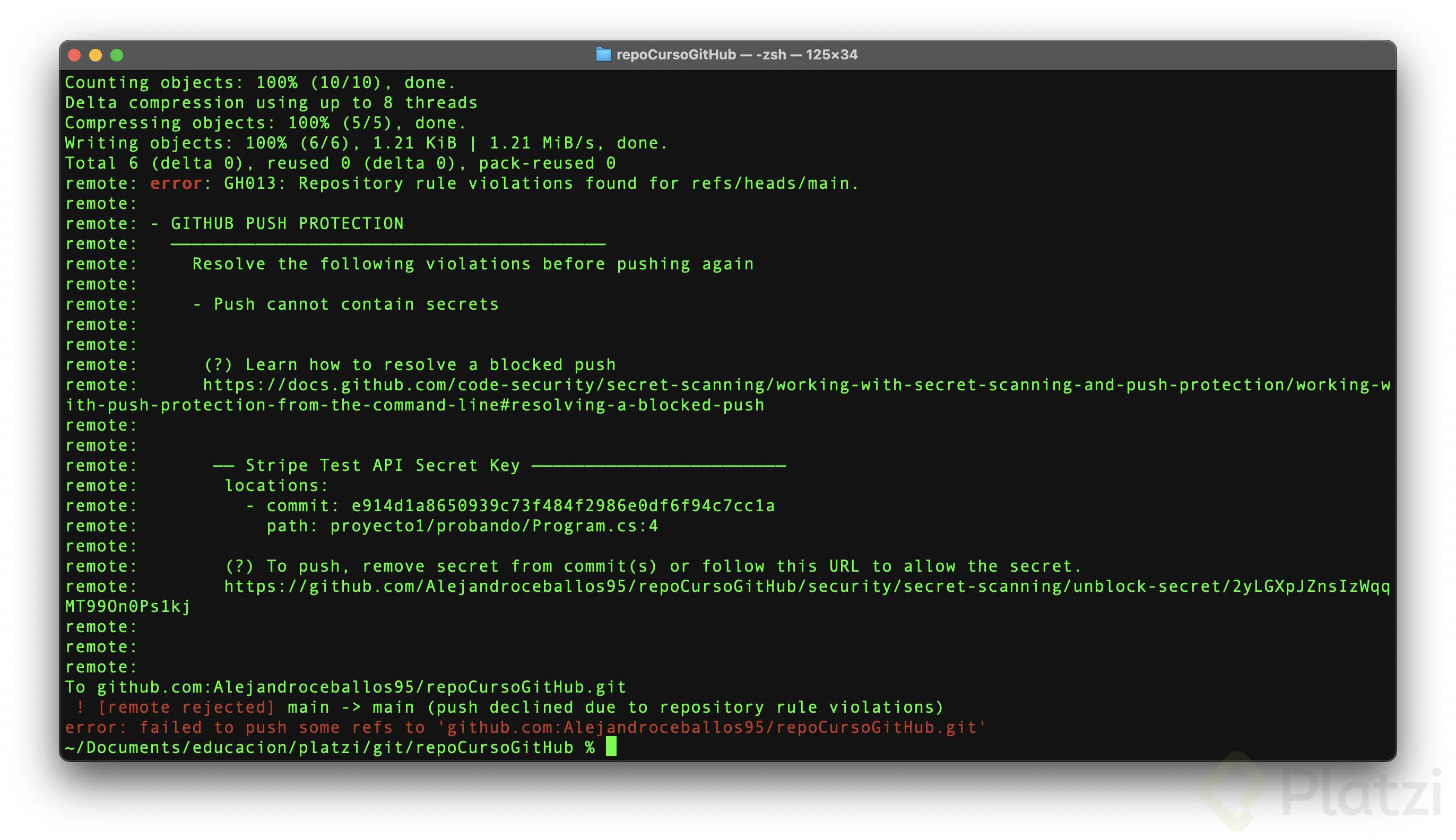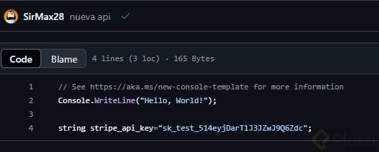 string stripeApiKey = "clave_sensible";en tu archivo de código y sube el cambio. - GitHub realizará el análisis en segundo plano y, si detecta una llave API, emitirá una alerta en la sección de Security.