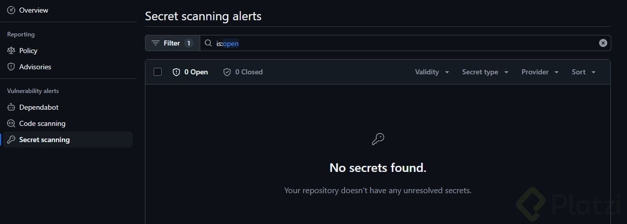 - Luego, asegúrate de que Secret Scanning esté habilitado. Esta función, que viene activada por defecto, detecta automáticamente secretos o llaves sensibles en el código.