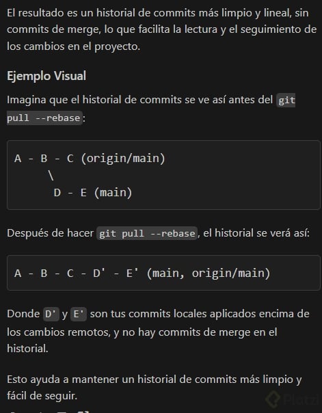 git config pull.rebase true: Esta opción hará que Git intente hacer un rebase que es exactamente como suena, la rama remota va a rebasar a las locales sobreescribiendo sus cambios haciendo que si la rama local quiere subir sus cambios entonces deberá hacerlos de nuevo, con una buena constancia de cambios esta estrategia es la más práctica.