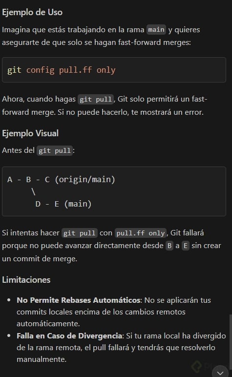 git config pull.ff only: Esta opción se refiere a un fast-forward, esto ocurre cuando la rama local está por detrás en los cambios de la rama remota y los commits de esta última rama pueden aplicarse sin crear un commit de fusión. Demasiado complicado ¿no? En otras palabras, se trata de poner los cambios de la rama local por encima de los de la remota, lo que no es la mejor idea porque podría afectar los cambios de otros miembros del equipo.