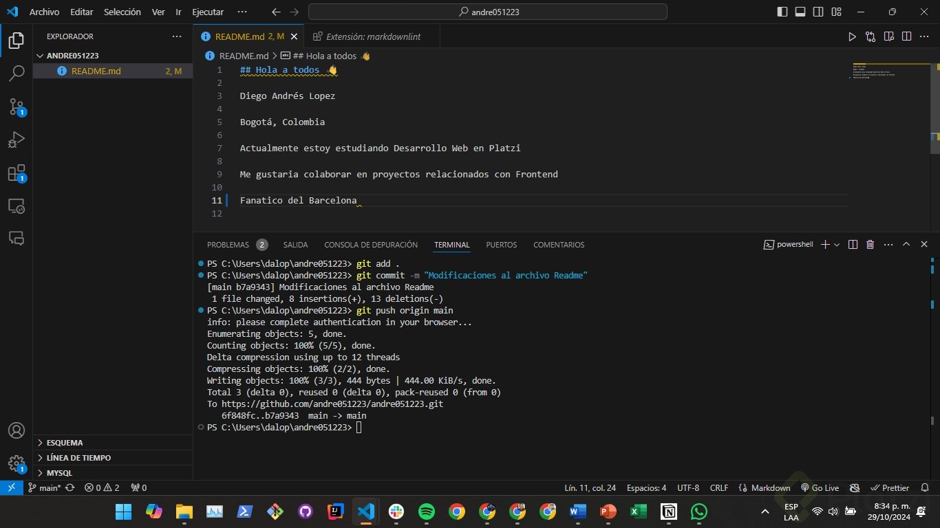 Open Previewen la esquina superior derecha para ver cómo se verán los cambios en GitHub. - Extensiones recomendadas: Markdown Lint ayuda a mejorar el estilo al sugerir tips sobre el formato, como evitar espacios en blanco innecesarios.