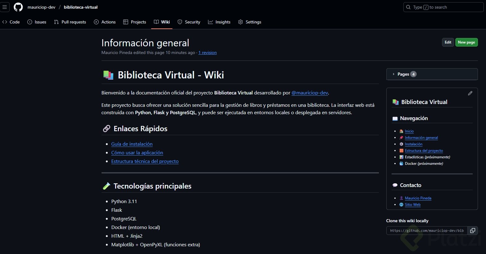 Una característica superinteresante es que puedes clonar esta wiki dentro de tu entorno local sin mayor problema, observa que hacer esto significa que solo vas a clonar todos estos documentos y no vas a hacer lo mismo con el repositorio lo que se me hace superinteresante porque puede ser que el portal de Github sea fantástico, pero no tanto como para pasar ahí horas leyendo documentos por lo que de esta manera puedes hacerlo desde tu lector de documentos Markdown favorito.