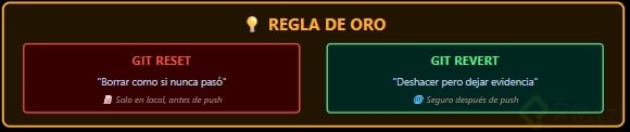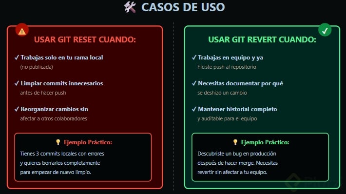 - Git Revert: crea un nuevo commit que revierte los cambios de un commit específico, permitiendo conservar el historial original sin eliminaciones. Es ideal para regresar a un estado anterior sin afectar los commits de otros usuarios.