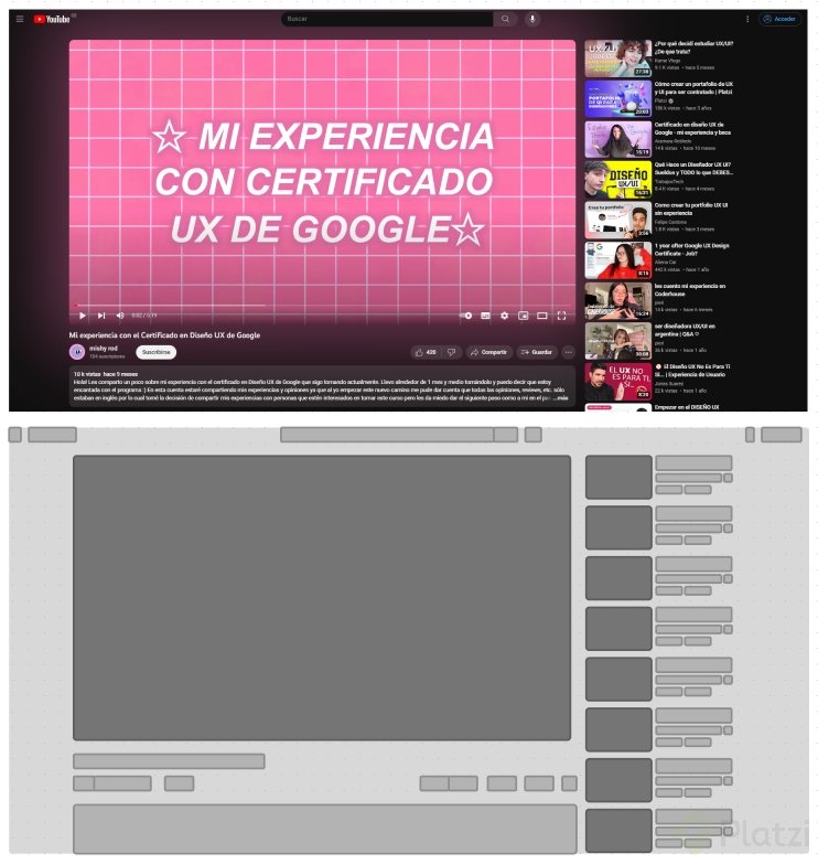 Aquí se puede ver un ejemplo de un Sketch de un producto digital. En él podemos ver diferentes tarjetas de contenido compuestas por una parte escrita y una imagen. También podemos ver más abajo un espacio en el que se incluirán vídeos.