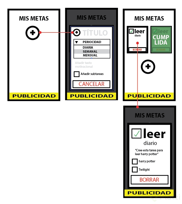 Dentro del diseño de los wireframes podemos encontrar un formato un poco más avanzado del diseño del producto, en el que se incluyen las relaciones que podremos encontrar entre las pantallas.