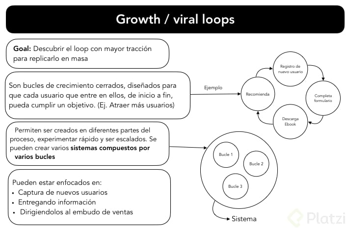 Growth Loops o viral loops: Son bucles de crecimiento diseñados como sistemas cerrados para garantizar que cada usuario que recorre cada etapa de entrada a la salida lo pueda hacer de forma infinita para atraer a más usuarios.