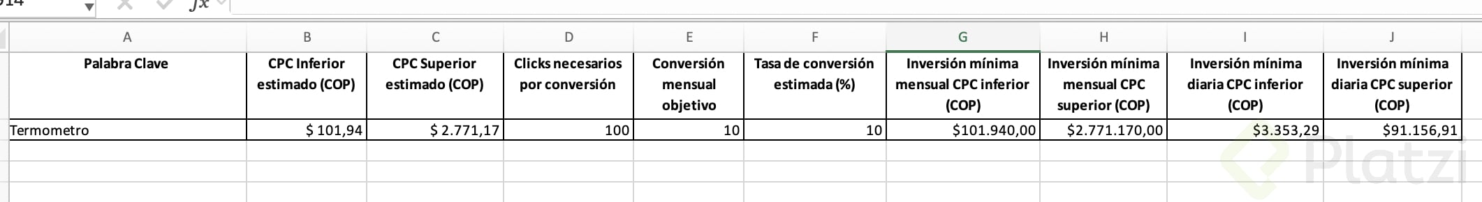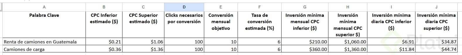 Con estos datos claros, puedes emplear un template (recurso descargable) para insertar tus datos y facilitar los cálculos. Así obtienes rápidamente el presupuesto mensual mínimo y máximo recomendado según las conversiones deseadas.